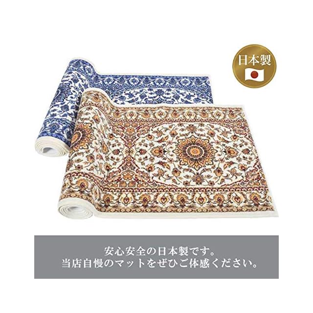 【特徴】繊細なタッチの豪華な模様が高級感を演出してくれる日本製廊下敷きカーペットです。【すべり止め】マットの裏面には、不織布に合成ゴム(ホットメルト)を溶着しているので、滑りにくく安全です。 別途、滑り止めシートをお求め頂く必要はございません。