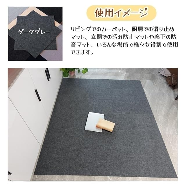 【床を保護・滑り止め・騒音防止】床を汚れたり、傷を付けたりすることを有効に防げます。タイルカーペッ ト表層の織物の生地は柔らかく、手触り感が良い、また防音効果もあり、騒音を生じることが効 果的に防げます。足音を和らげにして、子供部屋やフローリングのお部屋に最適です。ペットも自由に歩き回れ、階下への生活音を軽減できます。
