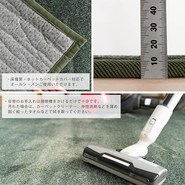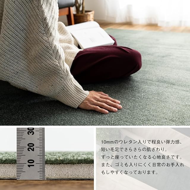【厚み】ラグ全厚:約13-14ミリ(パイル長:約3ミリ/中材:ウレタン厚み 約10ミリ)【組成】ポリエステル 100 % /縁テープ:細コーデュロイ/中材:ウレタン/裏面:不織布(ドット滑り止め付き)【原産国】中国