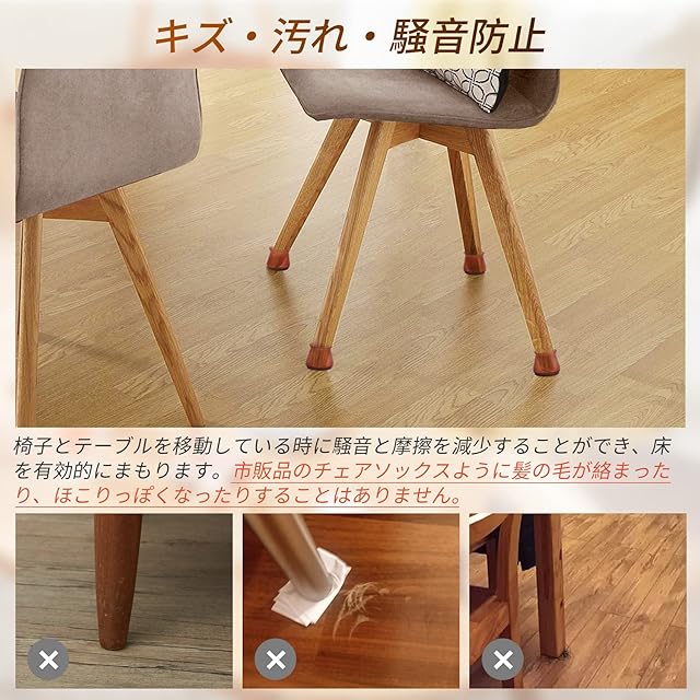 床や家具を保護:椅子を引く際のキズや騒音、振動をしっかり防ぐ椅子足キャップです。底面には防音性・耐摩耗性に優れたフェルト素材を採用しており、フローリングを傷つける心配がありません