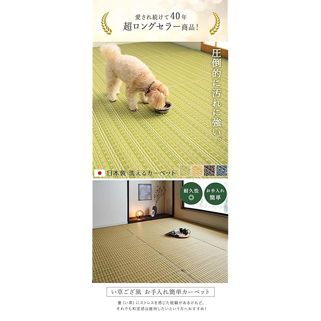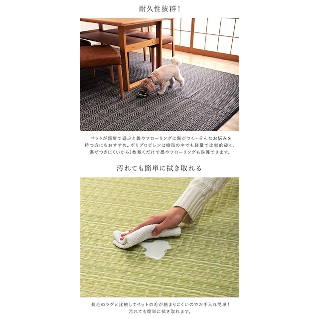 強度が高くしっかりとしています。 汚れても水洗いができるので、いつでも清潔にお使い頂けます。 カビが発生しない素材なので、カビを食するダニなども寄り付きにくいです。 一般的な除菌スプレーで拭いても色落ちせず、常に清潔な状態を保つことができます。 繊維が毛羽立つことが無く、埃が出にくく、日頃のお掃除が楽になります。 リビング、ダイニング、お子様のお部屋、など様々なシーンで活躍します。 ※ 畳のお部屋に上敷きとして使用する場合は市販の上敷き鋲との併用をおすすめします。 ※ 滑りやすい床等で使用する場合は市販の滑り止めシートとの併用をおすすめします。 ※ 掲載写真は表記サイズと異なる場合がございます。 ※ 画面上のカラーはご使用ブラウザやモニターの設定により、実物とは若干異なる場合がございます。あらかじめご了承の上、ご注文をお願いいたします。