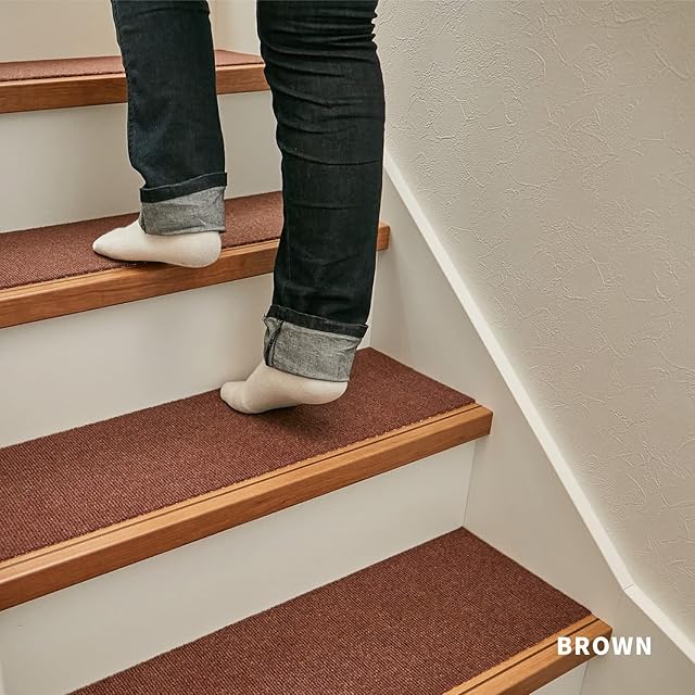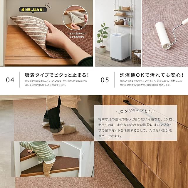 吸着で滑りにくい薄手の階段マットです。裏面の保護フィルムを剥がして置くだけで、滑りにくくピタッと敷くことができます。洗濯機で丸洗いできるので、いつでも清潔にお使いいただけます。