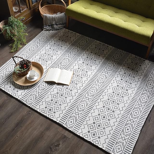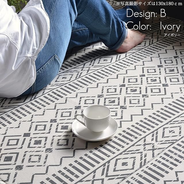 綺麗にインドでプリントされた生地に厚めの不織布を貼り合わせています。洗濯することも可能です。プリントの発色も良くまた生地なのでパイルなどはなくフラットで滑らかな表面です。お掃除も掃除機をかけていただくだけです。お掃除ロボットも段差に乗り上がればご使用は可能かと思います。けつまずきや引っかかりは全くありません。インドア及びアウトドアでもご使用になれます。付属のバックはしっかりと縫われたものでラグの移動やお買いのものにもお使いいただけるサイズになっています。