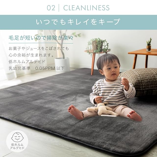 【特長】もっちりふわふわ感が心地いい極厚25mmのしっかりラグ。長い時間過ごすことの多いリビングにおすすめの極厚ラグです。毛足が短いので、お菓子のくずが入り込んだり、ペットの毛などもからみにくいから使い勝手もバツグン!掃除もしやすいので普段使いにはぴったり。さらに洗えるのもうれしい清潔仕様。乳幼児基準をクリアした低ホルムアルデヒド製品なので、小さなお子様の居るご家庭にもおすすめできる洗えるラグです。