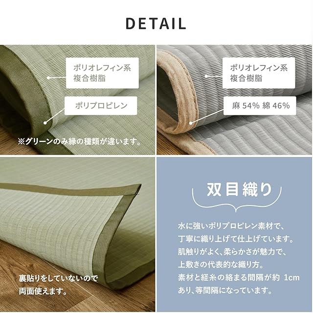 まるで本物のい草で織られた上敷きのようですが、水に強いポリプロピレン素材を使用し双目織りで丁寧に仕上げています。飲み物などをこぼしても、サッと簡単に拭き取ることができます。また、水洗いできるので、小さいお子様やペットのいるご家庭にもおすすめです。