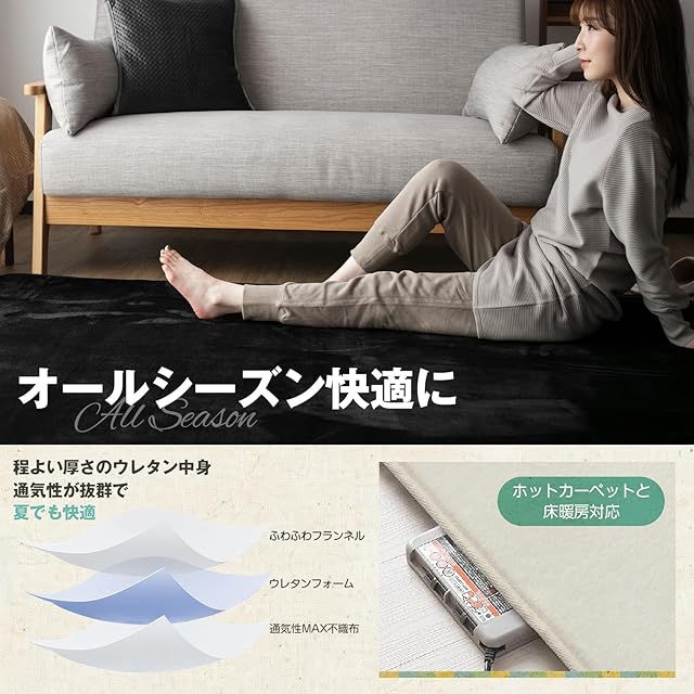 カーペット ラグ 絨毯 ラグマット 185×185cm(約2畳) 洗える 滑り止め 抗菌 防臭 防ダニ オールシーズン ホットカーペット対応 簡単に掃除 フランネル ブラック リプラクオール