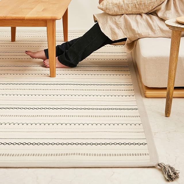 萩原 ラグ ブラック 約185×240cm 「ティック」 洗濯機で洗える 綿100% ウレタン入り 幾何学模様 ナチュラル タッセル付き