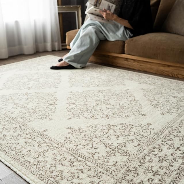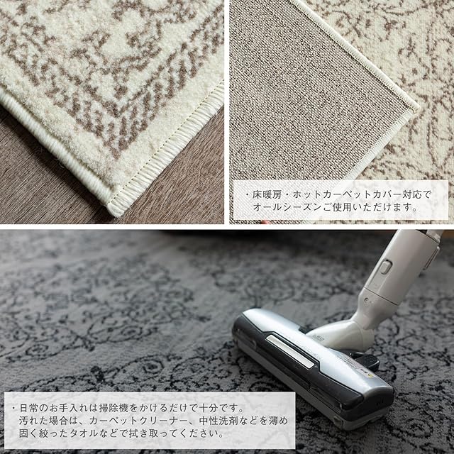 【輸入カーペットを安心してご利用いただくためのお願い】 ●輸入ラグに関して ※同じ商品でも製造ロットの違いによって、サイズや、色味、柄模様の左右が反転していたり、位置がズレている場合がございます。ただし、現地の工場や倉庫での検品をクリアした商品を輸入しています。あらかじめご了承くださいませ。/ ●においに関して ※ご使用当初、裏面に塗られる仕上げの接着塗料(ラテックス剤)のにおいがする場合がございます。人体への影響はありませんが、においに敏感の方や、ご心配の方はご理解の上ご購入お願いいたします。開封後常温のもとで気化(蒸発)するため、においはご使用につれてなくなります。気になる場合は風通しの良いところで陰干ししていただきますと、より早く解消されます。/ ●サイズに関して ※カーペットの製法上、表示サイズより ±0~4% の誤差がございます。/ ※いずれも商品の初期不良ではございませんので返品・交換は行なっておりません。(※お客様で返品の送料ご負担によるキャンセルは、返品規定に基づきお受けさせていただきます。)/ ※裏面の製品シールは剥がさないでご使用ください。