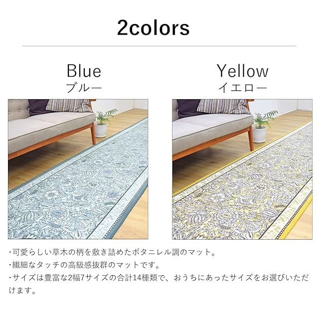 廊下敷き ロング カーペット 65cm×180cm【Botanirele(ボタニレル)】 日本製 マット 滑り止め 抗菌 防臭 吸水 速乾 ボタニカル 草木 自然 花 華憐 総柄 イエロー 黄