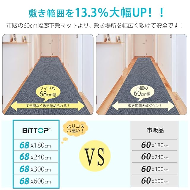 「都合によってカット可能」ハサミで自分の都合に合わせてカットできます。300×68cmのサイズなので、使いたい場所に合わせてサイズを自由にカットし、キッチンだけではなく、廊下、玄関、台所、階段、チェア、床のキズ防止用に役に立ちます。どごでも使え、マルチカーペットです。
