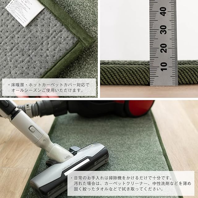 【備考】キッチンマットは、丸巻きまたは折り畳みの状態にてお届けいたします。(お客様によるご指定はいただけません) / 素材の特性上多少色落ちや色移りすることがあります。 / 手洗い可能(洗濯機の手洗いモードでのご使用は出来ません。)/ ※こちらのキッチンマット画像は、商品サイズ 45×180 cm を使用しております。 / 床暖房の上敷き、ホットカーペットカバー対応 。