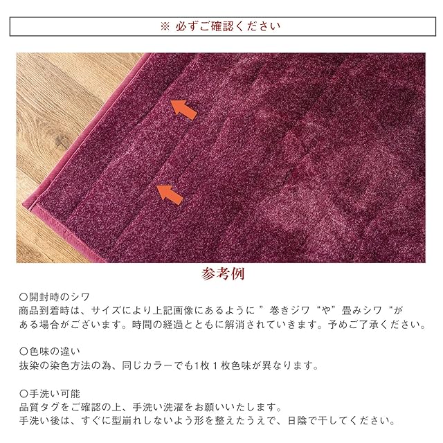 【輸入カーペットを安心してご利用いただくためのお願い】 ●輸入ラグに関して ※同じ商品でも製造ロットの違いによって、サイズや、色味、柄模様の左右が反転していたり、位置がズレている場合がございます。ただし、現地の工場や倉庫での検品をクリアした商品を輸入しています。あらかじめご了承くださいませ。●においに関して ※ご使用当初、ラグ裏面に塗られる仕上げの接着塗料(ラテックス剤)のにおいがする場合がございます。人体への影響はありませんが、においに敏感の方や、ご心配の方はご理解の上ご購入お願いいたします。開封後常温のもとで気化(蒸発)するため、においはご使用につれてなくなります。気になる場合は風通しの良いところで陰干ししていただきますと、より早く解消されます。●サイズに関して ※カーペットの製法上、表示サイズより0~3%の誤差がございます。※いずれも商品の初期不良ではございませんので返品・交換は行なっておりません。(※お客様で返品の送料ご負担によるキャンセルは、返品規定に基づきお受けさせていただきます。)※ラグ、マット裏面に製品シールが貼っている場合は剥がさないでご使用ください。