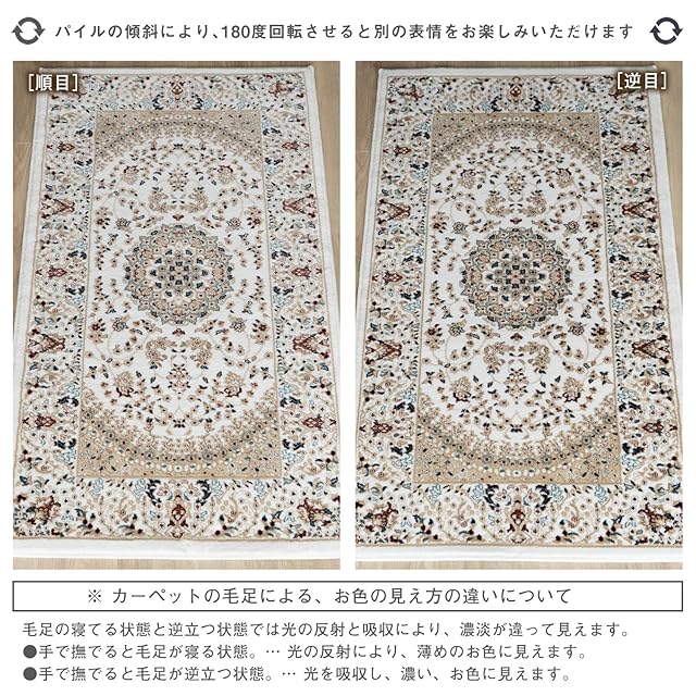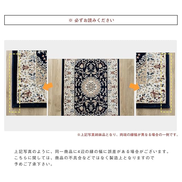 【輸入カーペットを安心してご利用いただくためのお願い】 ●輸入ラグに関して ※同じ商品でも製造ロットの違いによって、サイズや、色味、柄模様の左右が反転していたり、位置がズレている場合がございます。ただし、現地の工場や倉庫での検品をクリアした商品を輸入しています。あらかじめご了承くださいませ。/ ●においに関して ※ご使用当初、裏面に塗られる仕上げの接着塗料(ラテックス剤)のにおいがする場合がございます。人体への影響はありませんが、においに敏感の方や、ご心配の方はご理解の上ご購入お願いいたします。開封後常温のもとで気化(蒸発)するため、においはご使用につれてなくなります。気になる場合は風通しの良いところで陰干ししていただきますと、より早く解消されます。/ ●サイズに関して ※カーペットの製法上、表示サイズより0~3%の誤差がございます。/ ※いずれも商品の初期不良ではございませんので返品・交換は行なっておりません。(※お客様で返品の送料ご負担によるキャンセルは、返品規定に基づきお受けさせていただきます。)/ ※裏面の製品シールは剥がさないでご使用ください。
