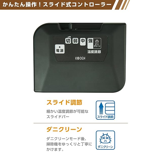 【スライド式温度調節コントローラー】本製品の温度調節はスライド式温度調節コントローラーです。「弱」「中」「強」の3段階だけでなく中間の温度にも設定が可能ですので、お好みの温度であたたまることができます。