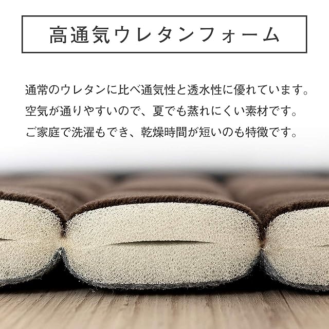 【組成】<表面>ポリエステル95% / ポリウレタン5% <中材>2層ウレタンフォーム <裏面>ポリエステル100%(不織布)