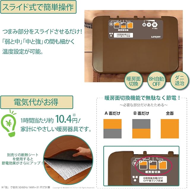 【多彩な機能のコントローラー】全体を温めるだけでなく、 A面とB面を切り替える機能がついています。 必要な箇所だけ温めたいときに、この機能を使うと省エネになります。 また、電源オンから約8時間後に自動的に通電が止まる自動OFF機能搭載。 電源切り忘れを防止する安心設計です。