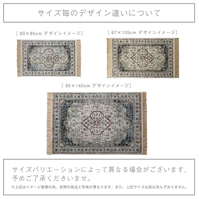 【輸入カーペットを安心してご利用いただくためのお願い】 ●輸入ラグに関して ※同じ商品でも製造ロットの違いによって、サイズや、色味、柄模様の左右が反転していたり、位置がズレている場合がございます。ただし、現地の工場や倉庫での検品をクリアした商品を輸入しています。あらかじめご了承くださいませ。/ ●においに関して ※ご使用当初、裏面に塗られる仕上げの接着塗料(ラテックス剤)のにおいがする場合がございます。人体への影響はありませんが、においに敏感の方や、ご心配の方はご理解の上ご購入お願いいたします。開封後常温のもとで気化(蒸発)するため、においはご使用につれてなくなります。気になる場合は風通しの良いところで陰干ししていただきますと、より早く解消されます。/ ●サイズに関して ※カーペットの製法上、表示サイズより0~3%の誤差がございます。/ ※いずれも商品の初期不良ではございませんので返品・交換は行なっておりません。(※お客様で返品の送料ご負担によるキャンセルは、返品規定に基づきお受けさせていただきます。)/ ※裏面の製品シールは剥がさないでご使用ください。