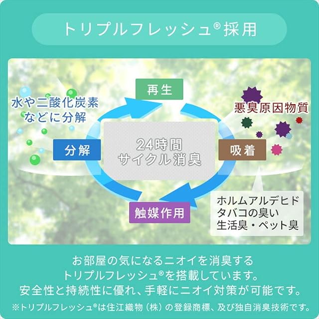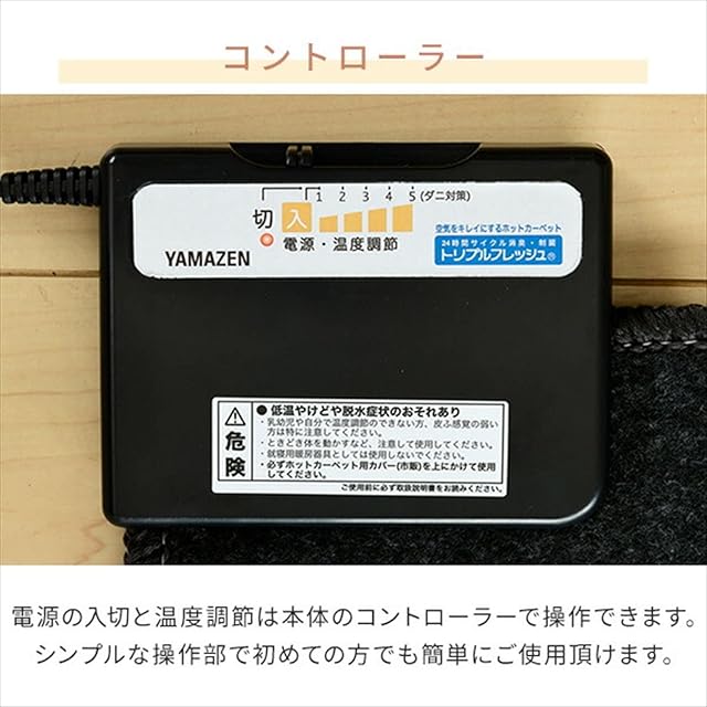●消費電力:200W ●表面温度:(目盛3)約36度、(目盛5)約45度 ●電気代目安(1時間あたり):(目盛3)2.7円、(目盛5)4.3円 ※電気料金目安単価 27円/kWhを基に算出 ●電源コード長さ:1.5m ●ホルムアルデヒド、タバコのにおい、生活臭、ペット臭を消臭(吸着・分解)するトリプルフレッシュ採用で空気をキレイにします ※消臭加工はホットカーペット本体のみになります ●温度調節:5段階 ●カバー付き ●すべり止め加工 ●ダニ退治機能 ●こたつ併用可