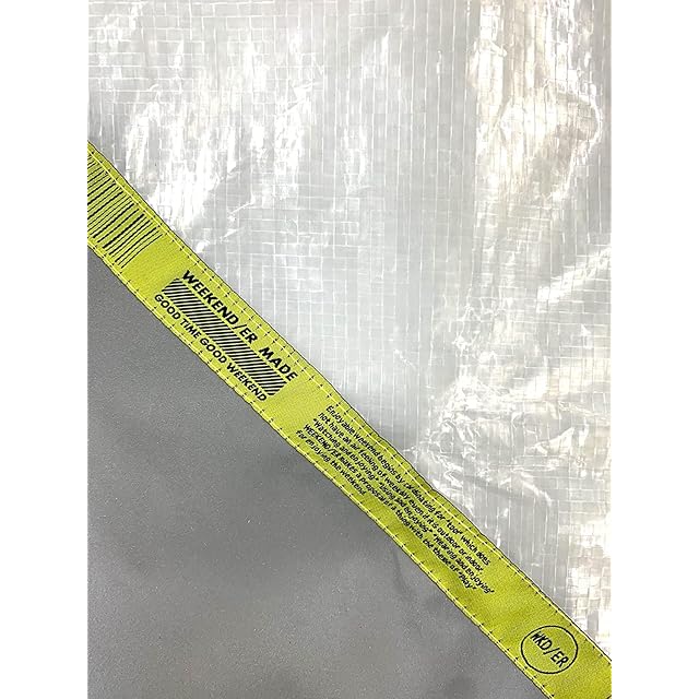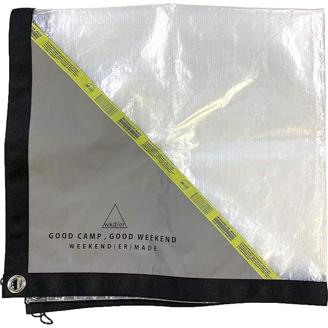 水に強く、引き裂きに強い、汚れが付きにくいPE(ポリエチレン)素材を使用し、マルチに使えるシートを作りました。 発売中のキャンプアイテムパッキングシリーズと同じ素材、WEEKEND(ER)のロゴテープとリフレクション生地を使用しています。 キャンプ時の荷物の積み下ろしの際に地面に敷き、汚れを防ぎ、車内やテント内に入れるものを汚さないようにします。 四隅にはハトメ、辺の中央にはリフレクションコードでループを付けており、シートが風で飛ばされないようペグ等で地面に固定が可能です。 リフレクション生地を三角形に縫い付け、夜間の視認性を高めています。 広げてグランドシート代わりにしたり、必要な大きさに畳んで汚したくないものの下に敷いたり、簡易的な雨除けとして使ったりと、1枚あると重宝するマルチに使えるアイテムです。