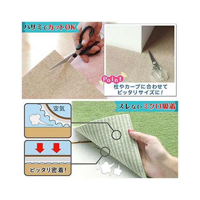 スペースに合わせて自由に組み合わせて敷くことができ、床面の形に合わせて、ハサミで簡単にカットできる。