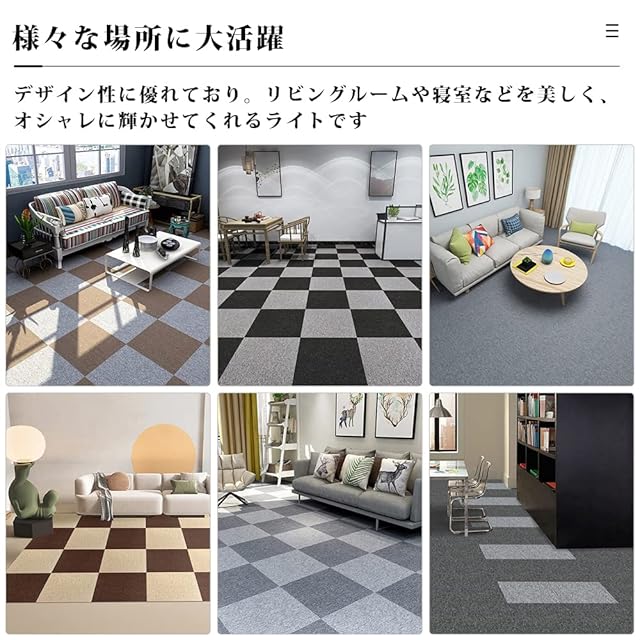 【高品質ある素材・賃貸OK】●タイルカーペットは表面:ポリエステルを使います。高品質ある素材ですので、摩擦に強いため擦り切れにくく。カーペットは 季節に問わず1年中に使える。また、撥水性に優れているので汚れも付きにくいです。新築や賃貸で床保護マットとして活躍。●撮影機材や照明などの問題により、写真と実際の商品との間にちょっと色の違いがあります。
