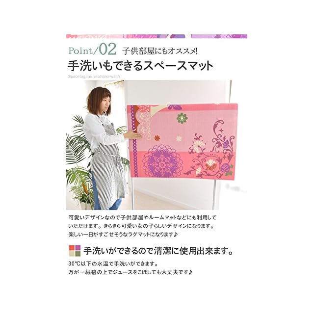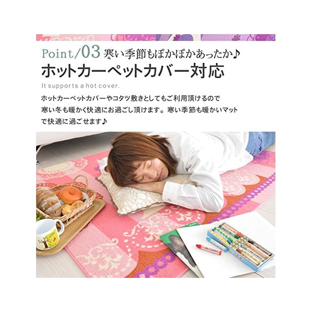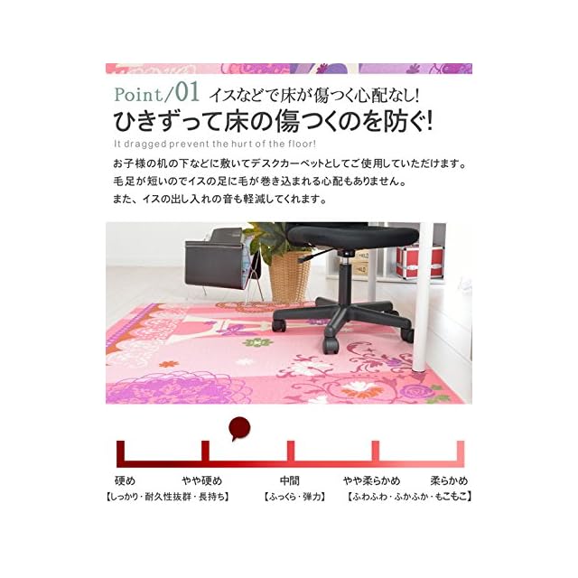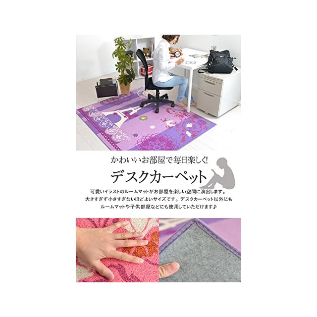 デスクカーペットってなくてもいいものじゃない?<br> そう思っている方は少なくないと思います。そこでデスクマットを敷くメリットについてご説明してきます!!<br> デスクマットは普段動かさず敷きっぱなしにしておくものです。だから敷かなくてもいいんじゃないかって思ってしまうんですよね。<br> ところが机は意外と重たいもので教科書や辞書、本、ライトなどの小物だったり色んなものの重さがさらに加わります。<br> 傷がつくより机の足の床を接地している部分だけ凹んでしまうという現象が起きます。<br> それを少しでも防ぐためにデスクカーペットはあった方がよいのです。<br> それだけでなく、椅子の足で床が傷つくということも無くしてくれます。毛足の短いパイルならお手入れも掃除機だけで 簡単に済むのでお掃除時間もサッと掃除機を掛けるだけの短時間でOK! <br><br> 素材:ポリプロピレン100%<br> 裏材:不織布<br> パイル長:約2mm<br> 全厚:約7mm<br> 機能:手洗いOK・ホットカーペット対応・床暖房対応・こたつ敷きOK<br> カラー:パープル・ピンク<br> サイズ:110x133・133x170<br> 製造:中国<br> <br><br> ※カーペット・ラグは織物である為、多少の誤差や伸縮が発生する場合がございますので予めご了承下さい。