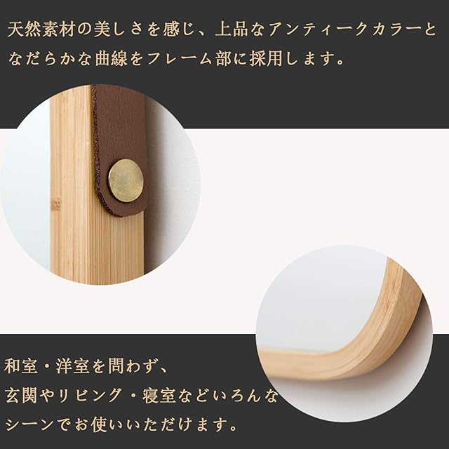 【しっかりとした作り】枠には耐久性に優れた竹を採用し、美しく硬く耐久性良いです。竹部は天然成分で人体に無害なクリアラッカー塗装を施し、自然な光沢に仕上げました。鏡部分も「飛散防止」加工されています。
