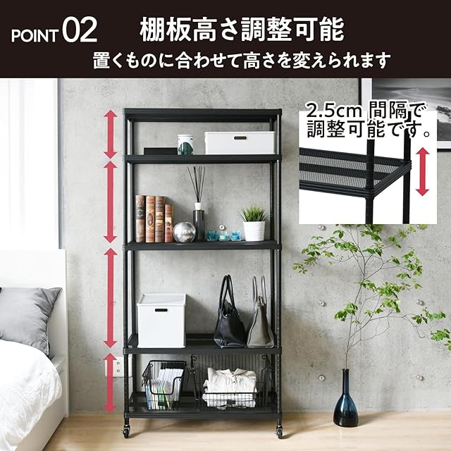 【メッシュの棚板】網目が細かい棚板なので、物が落ちにくくお部屋の圧迫感も軽減できます。棚の高さを2.5cm間隔で調整可能です。