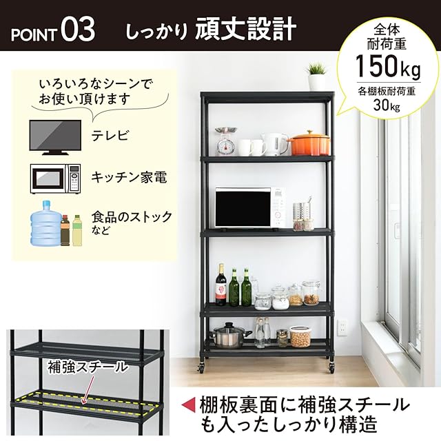 【耐荷重150kg】棚板裏面に補強スチールも入ったしっかり構造なので、本棚として使ったりキッチンアイテムの収納にもお使い頂けます。