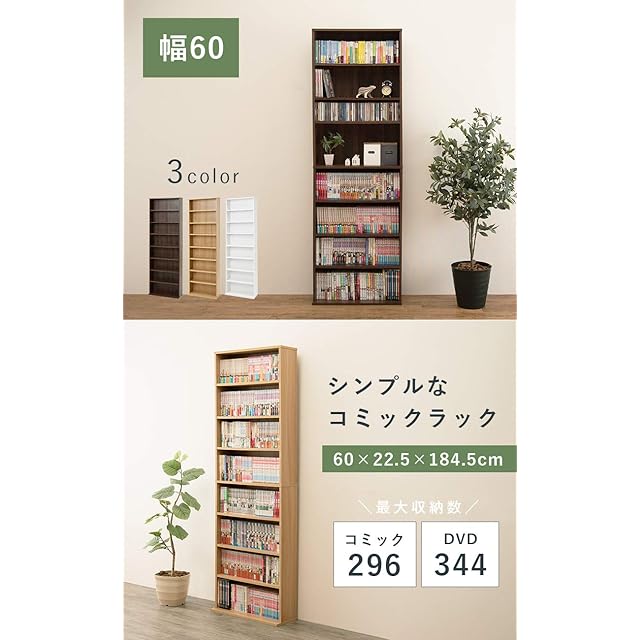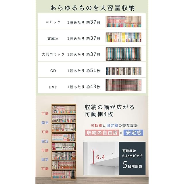 【コミック・dvd・文庫本が大量収納】コミックだと最大で約296冊、dvdだと約344枚収納できるサイズ。さらに、5段階調節の可動棚4枚と固定棚4枚を交互に配置。収納の自由度と安定感の両立ができる設計に仕上げました。
