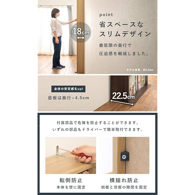 【スリムな奥行で圧迫感を軽減】奥行は約18cmと省スぺ―スなデザイン。最低限の奥行で圧迫感を軽減しました。(底板は奥行約22.5cmと少し広くし、全体の安定感をアップさせています。)