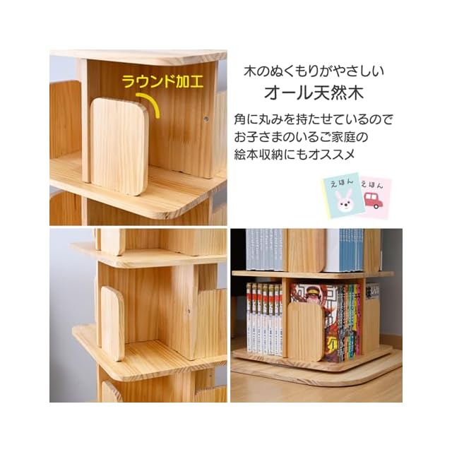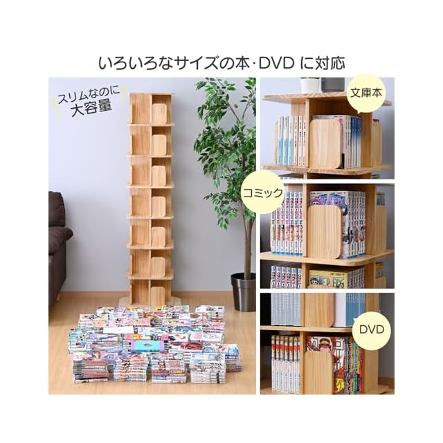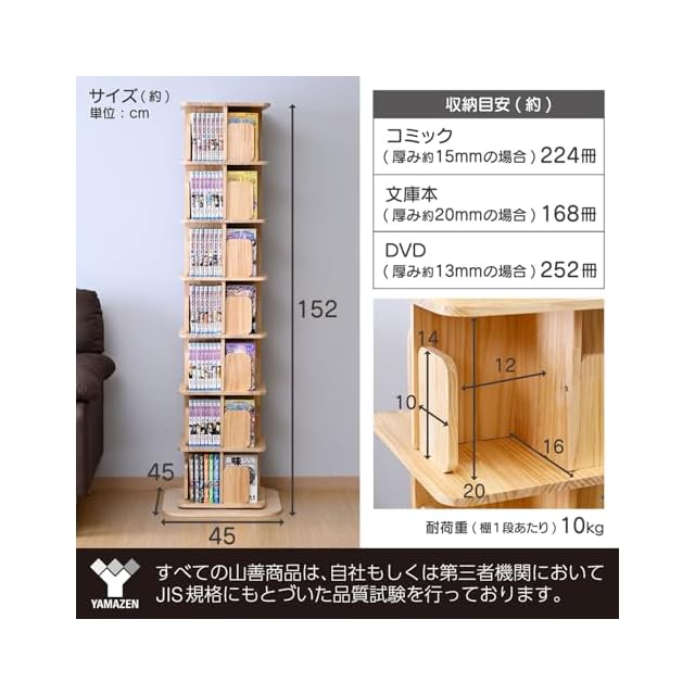 ●本体サイズ(約):幅45×奥行45×高さ152cm●側板サイズ : 幅10×高さ14cm●1マスあたりのサイズ(約) : 幅12×奥行(最大)17×高さ20cm ●1マスあたりの収納目安 : コミック(厚み約15mmのもの)約8冊、文庫本(厚み約20mmのもの)約6冊、DVD(厚み約13mmのもの)約9枚●耐荷重(棚1段あたり) : 10kg●構造部材 : 本体/天然木、回転盤/金属(スチール)●表面加工 : ラッカー塗装●東証プライム(株)山善で扱うすべての山善商品は、自社もしくは第三者機関において、JIS規格に基づいた品質試験を行っております。