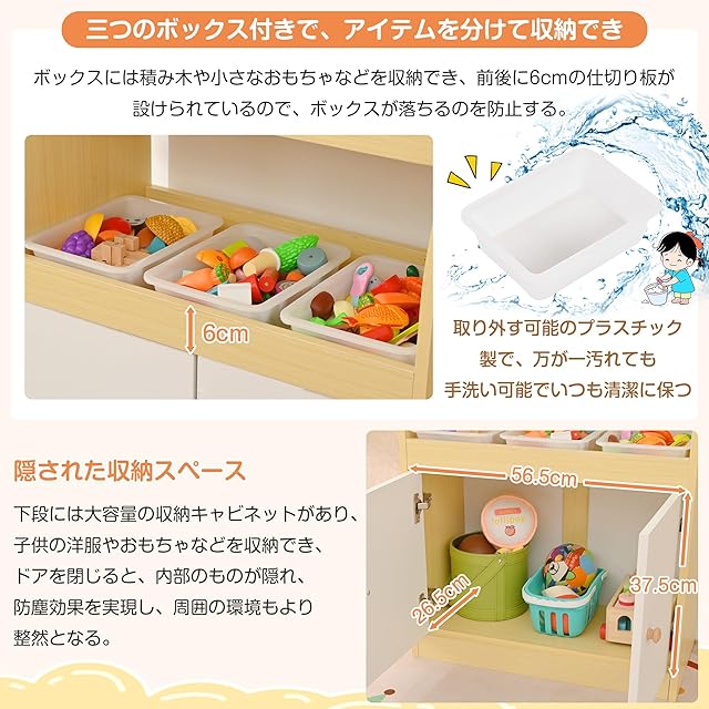 【なんでも収納できるBOX】絵本棚の下段はノートや雑多な小物等も収まる広めの収納スペースとなっております、本、写真、ステレオ、目覚まし時計、置物など。BOXが3つあり、おもちゃやお服などすっきり収納できます。さらに、BOXは軽くて持ち運びしやすく、出し入れも便利で、お子供でも簡単に分別収納できます。豊富な収納力はお家の中だけでなく、病院の待合室·児童館、キッズスペース、図書室などでのご利用にも適しています。お部屋の景観を崩さず、おしゃれな雰囲気を保っていただけます。