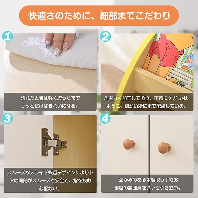 【隠された収納スペース&空間を活用】下段には大容量の収納キャビネットがあり、子供の洋服やおもちゃなどを収納でき、ドアを閉じると、内部のものが隠れ、防塵効果を実現し、周囲の環境もより整然となる。さらに、厚みスッキリだから、お部屋に圧迫感を作らない!複数使いで収納力がアップし、統一感のあるキッズスペースが完成します。