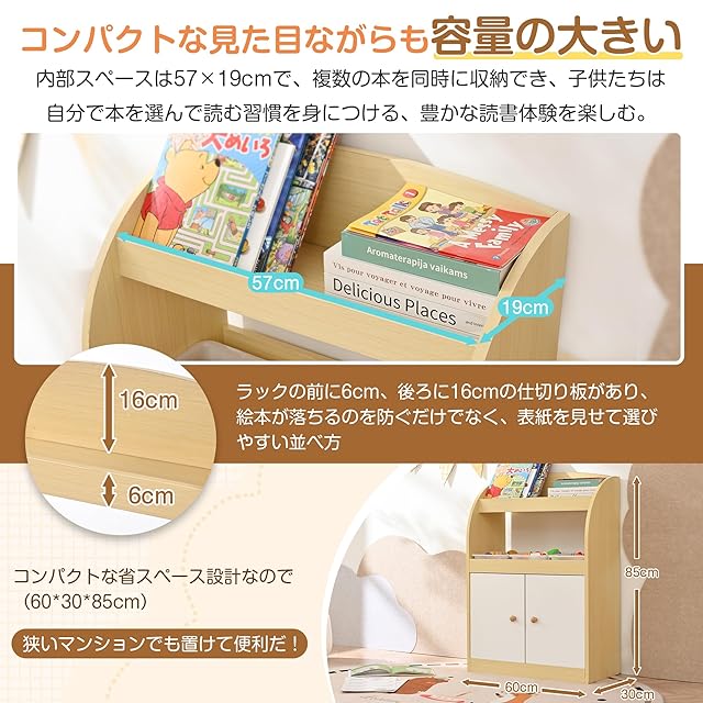 【収納力抜群でお部屋すっきり】様々なシーンに対応し、収納をより快適に。絵本ラックの上部は内部スペースがあり、お気に入りの本をすっかり収納できます。また、表紙が見える面出し構造で、お子供の目線でも選んで手に取りやすいです。