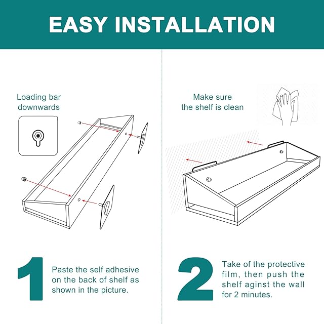 アクリル製フローティング棚 - このアクリル製バスルーム棚は素晴らしい品質のアクリル製で、耐候性に優れ、壊れたり変形したりしにくく、透明な素材で見た目もすっきりしており、展示会を開催するのに耐久性と安定性があります。 角が丸く設計されており、滑らかな表面で手を傷つけません。<br /><br />実用的なデザイン - アクリル棚の側面は特別に設計されており、バッフルがアイテムの滑りを防ぎます。 側面にある水出口により、水が非常に簡単に流れ出し、清潔で乾燥した状態に保ちます。<br /><br />優れたスペース節約 - アクリル棚は、お好きな場所に個別に、またはまとめて取り付けることができます。 壁に取り付けたり、テーブルに直接置いたりできます。 スペースを節約し、すべてをきちんと整理整頓するのに役立ちます。<br /><br />取り付け簡単 - 穴あけ不要の取り付けとネジによる取り付けの2つの取り付け方法を提供します。 1. 粗い壁に穴を開け、ネジで取り付けることができます。 2. 壁用接着剤で滑らかな表面に貼り付けるだけです。 取り付ける前に必ず保護フィルムを剥がしてください。<br /><br />多目的用途 - 当社のアクリル棚は、寝室、リビングルーム、バスルームのスペースに美しい収納を簡単に追加します。 カウンタートップでも大活躍します。 バス用品、コスメティック、スキンケア、マニキュアボトル、歯磨き粉、エッセンシャルオイル、香辛料、本などに最適です。 手の届く範囲にすべてをきちんと整理するのに役立ちます。<br /><br />