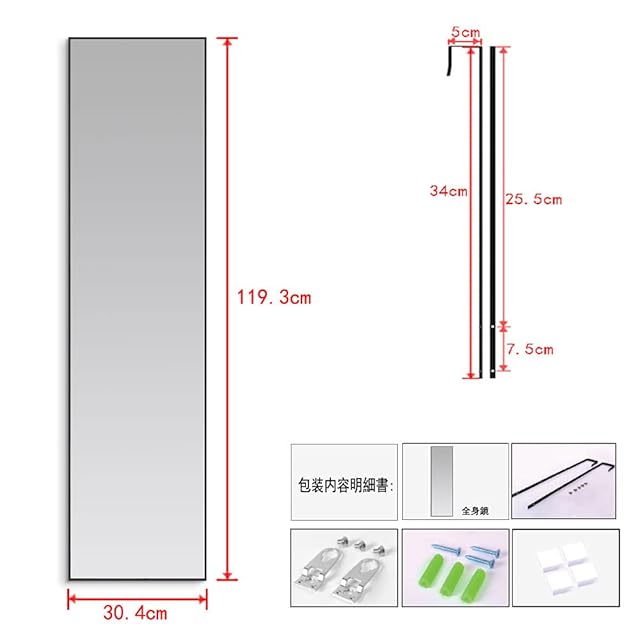 6.パッケージ内容:全身鏡1個、フック2個、接着剤1セット、ネジ1セット。