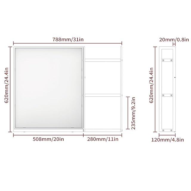 【大容量の収納スペース】ファームハウスの壁掛け化粧鏡のサイズは20×24.4インチ、棚付きミラーのサイズは31×24.4インチで、バスルームの収納スペースが増え、部屋がより広くなります。