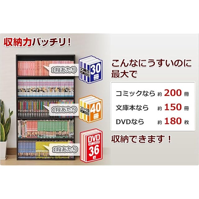 【スリムだけど大容量】コミック本なら約200冊とたくさん収納できるので、お部屋をすっきり片づけられるラックです。収納目安(最大):コミック200冊、DVD180枚、文庫本150冊