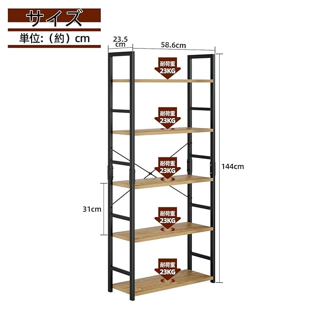 【5段多機能本棚】丈夫で安定しています。各プレートの負荷は、少なくとも23kg。多機能の本棚は、本、おもちゃ、写真、観葉植物などを置くことができます。リビングルーム、書斎、寢室、オフィスに適用します。ホームとオフィスのスペースを驚くほど整然になる本棚です。全体寸法:幅58.6㎝×深さ23.5㎝×高さ144cm。