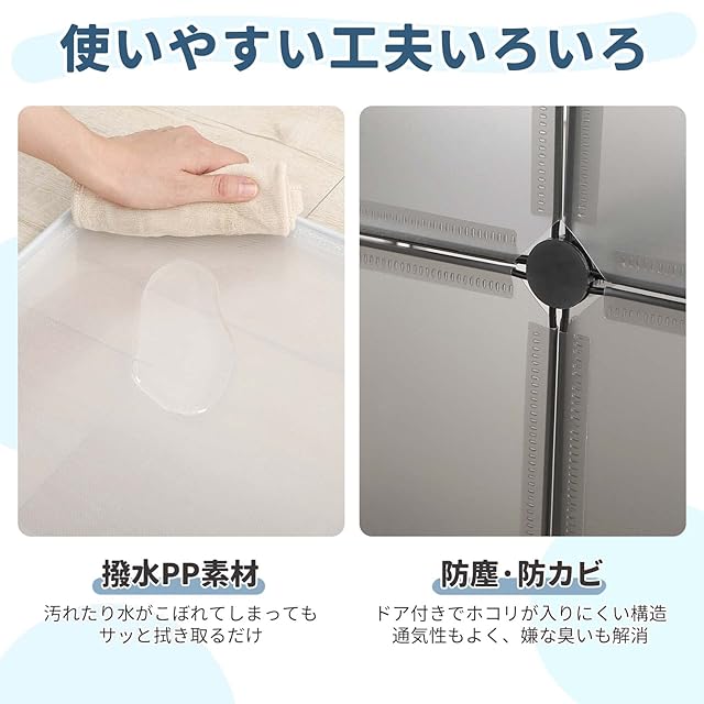 【しっかりとした作り ドア付きの防塵構造】●扉付き収納棚でホコリが入りにくい。●棚板:環境に優しく、耐久性にも優れたPP材質で、お子様がいるご家庭でもお使いいただける。●フレーム:頑丈なスチール製で、棚板をガッチリ支えてかなり安定感がある。●連結パーツ:高品質ABS樹脂製で、強度と耐衝撃性を両立。