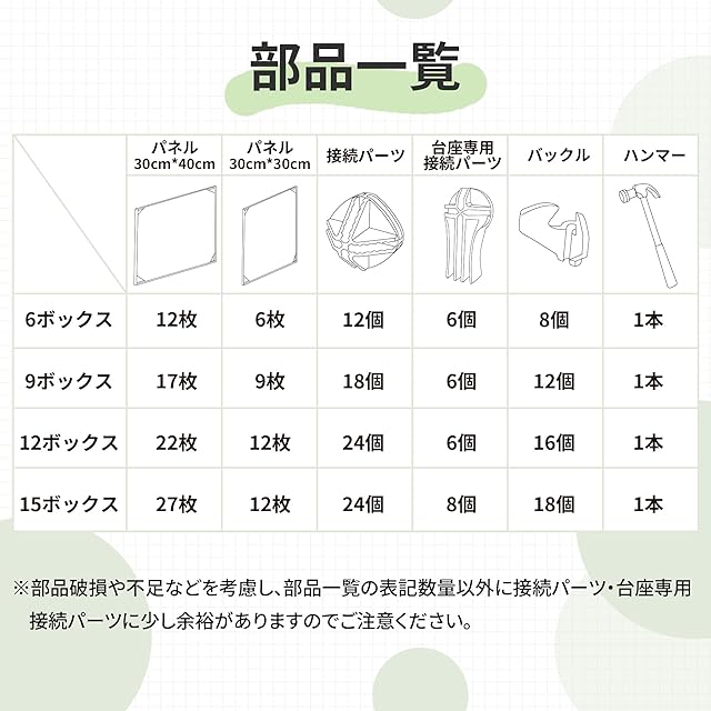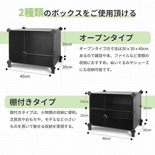 【2種類のボックスをご使用頂ける】●オープンタイプの寸法は30x30x40cmあるので雑誌や本、ファイルなど書類の収納におすすめ。ぬいぐるみやシューズにも収納可能です。●棚付きタイプは、小物類の収納に便利。文房具やおもちや、モデルなど小さいものを置いて魅せる収納を実現する。