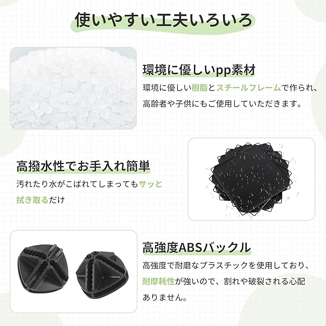 【しっかりとした収納棚】●棚板:環境に優しく、耐久性にも優れたPP材質で、お子様がいるご家庭でもお使いいただける。●フレーム:頑丈なスチール製で、棚板をガッチリ支えてかなり安定感がある。●連結パーツ:高品質ABS樹脂製で、強度と耐衝撃性を両立。●撥水性あるのでお手入れ簡単。