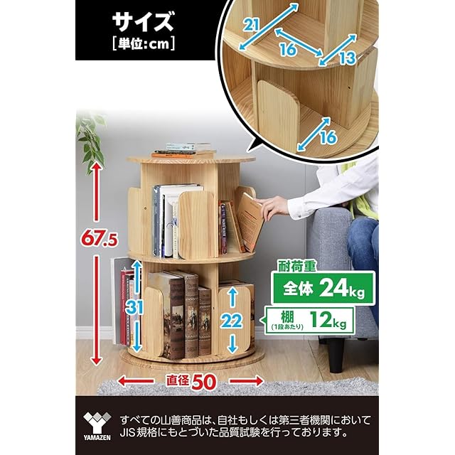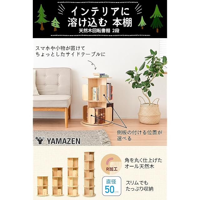 山善(YAMAZEN) 本棚 (回転式本棚) 絵本棚 天板に物が置ける A4が入る高さ 2段 (直径50cm×高さ67.5cm) 天然木 漫画 小さい本棚 ブックシェルフ 組立品 ナチュラル TKR-2(NA)