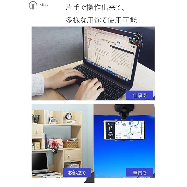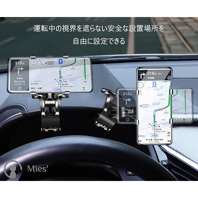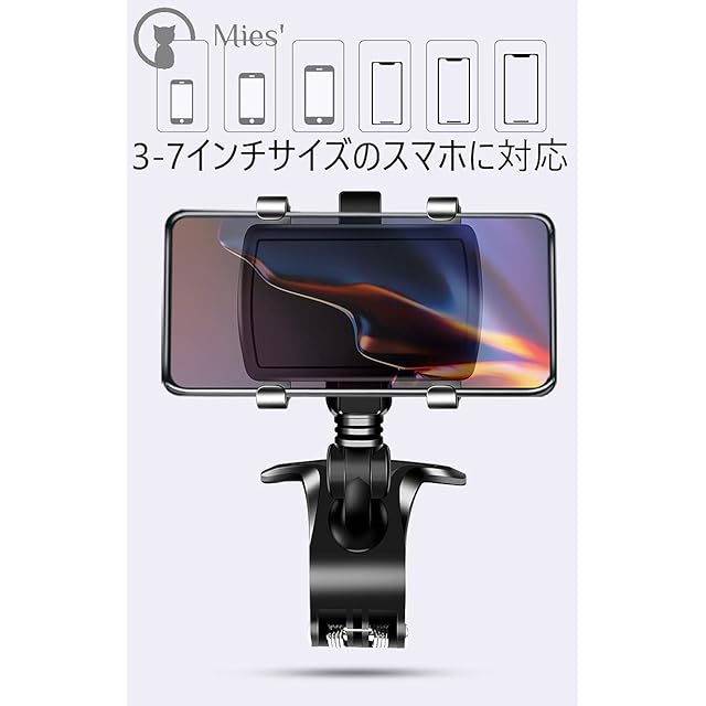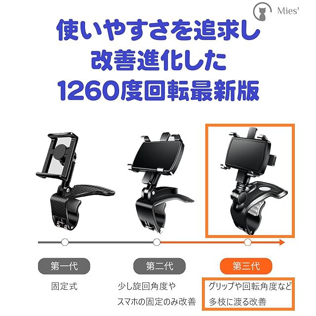 Mies’ 1620度 1260度 回転 高機能 スマートフォンフォルダー 車載ホルダー クリップ式 ダッシュボード/デスク/サンバイザー 適用 スマホスタンド スマホホルダー 車 クリップ 360度回転可 着脱簡単 落下防止 iPhone Android 7インチまで多機種対応 (1260度回転)