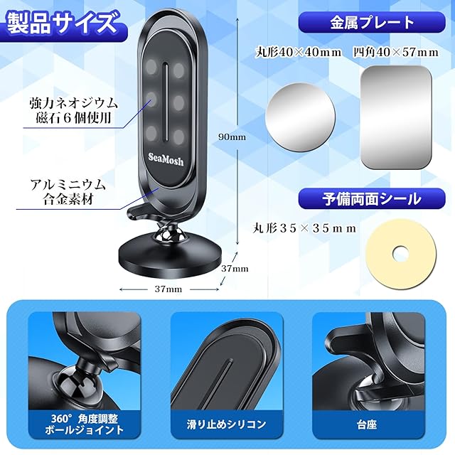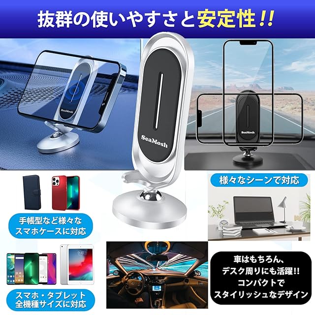 シーモッシュ 車載ホルダー マグネットスマホホルダー 車 スマホスタンド 手帳型スマホケース対応 スマホ タブレット対応 アルミ合金製 (Black)