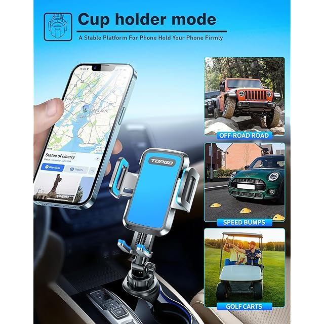 スマホホルダー 車 ドリンクホルダー 車載ホルダー カップホルダー スマホスタンド 車 TOPGO 【 機械式伸縮アーム・安定性 車載 携帯ホルダー 縦・横・上下・左右自在調節 360度回転 片手操作 ワンタッチ iPhone 14 Pro Max/Galaxy S23 Ultra 多機種対応(ブルー)