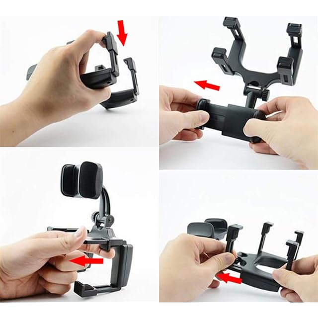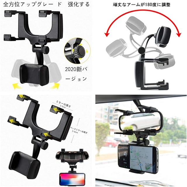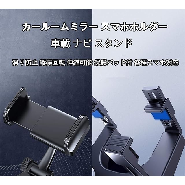 Zukida 2022新 補強を強化する車載 ホルダー ルームミラー取り付け型 カールームミラー スマホホルダー 車載 ナビ スタンド 滑り防止 縱橫回転 伸縮可能 保護パッド付 各種スマホ対応(ブラック)