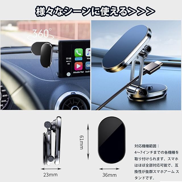 バージョンアップ!ダブルな360度回転スマホホルダー!!スマホホルダーの台座が360度回転可能し、末端のユニバーサルボールも360度回転できます。ダブルな360度回転式の車載スマホホルダーは様々な角度を調節でき、より自由に使えます。任意の場所に固定でき、最もよい角度を提供できます。</br>