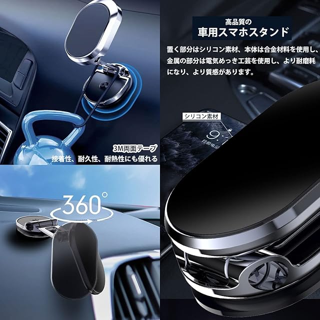 車マグネットスマホスタンドの置く部分はシリコン素材、本体は合金材料を使用、スマホホルダーの頑丈と安定を保証できた同時に、金属の部分は電気めっき工芸を使用し、より耐磨耗になり、より質感があります。見た目が高級で、上品感が溢れます。</br>
